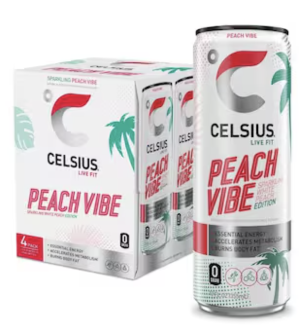 Celsius Sparkling Peach Vibe, Energy Energy Drink, 12oz, 4 Count