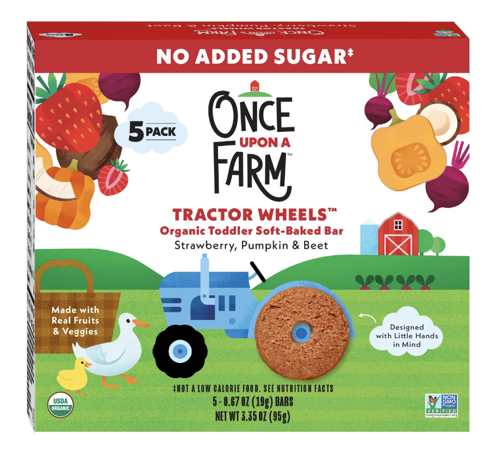 Once Upon a Farm No Added Sugar Tractor Wheels, Organic Toddler Soft-Baked Bar, 5 Ct.Strawberry, Pumpkin & Beet 3.35 oz Box